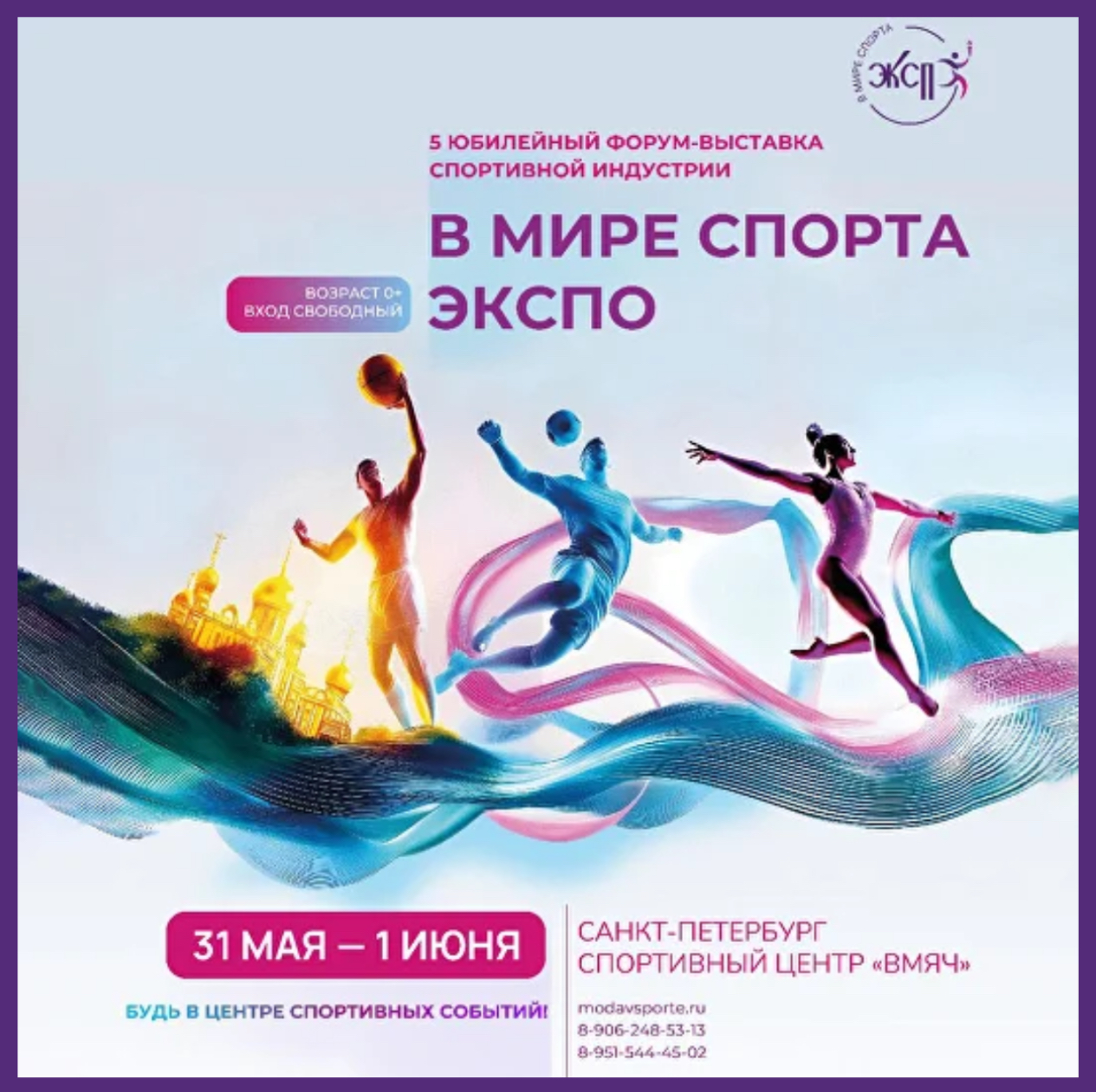 Приглашаем вас на юбилейную, V Международную выставку спортивной индустрии "В мире спорта Экспо", которая состоится 31 мая - 1 июня, в Санкт-Петербурге, в Спортивном центре "ВМЯЧ": мастер-классы, финал конкурса дизайнеров, выставка товаров для эстетических видов спорта, модные показы, спортивные соревнования...